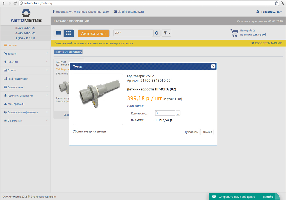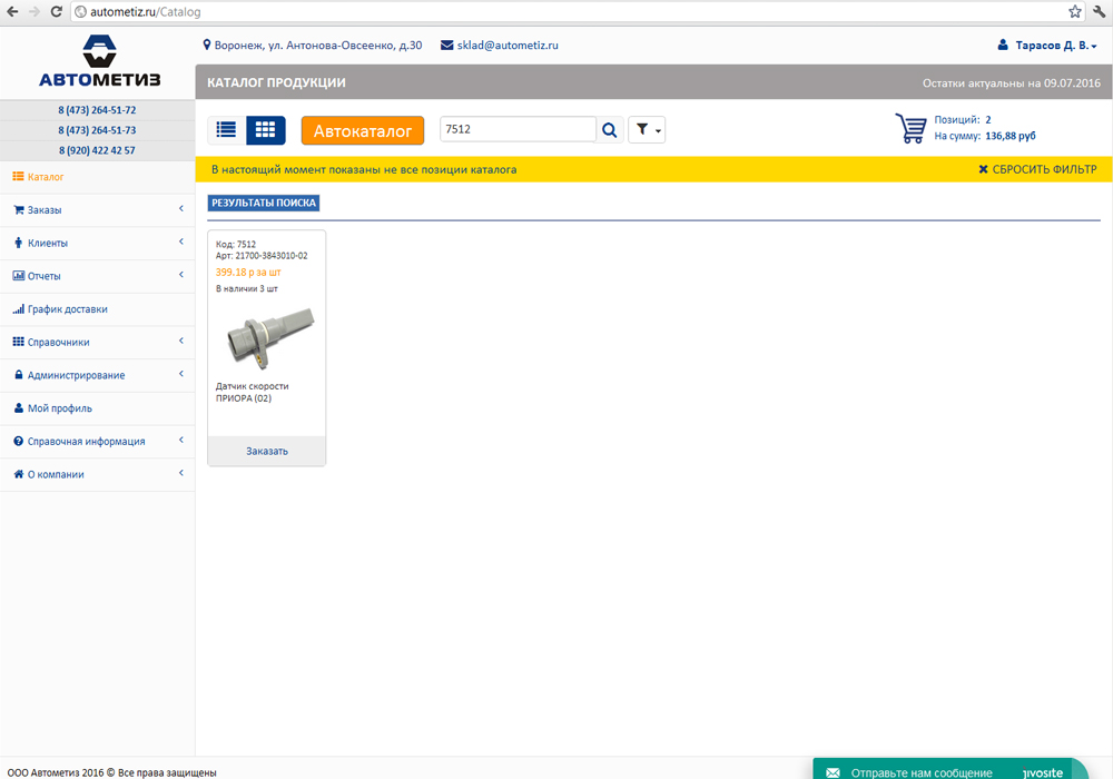 В системе предусмотрен очень удобный поиск товара по наименованию, артикулу, коду